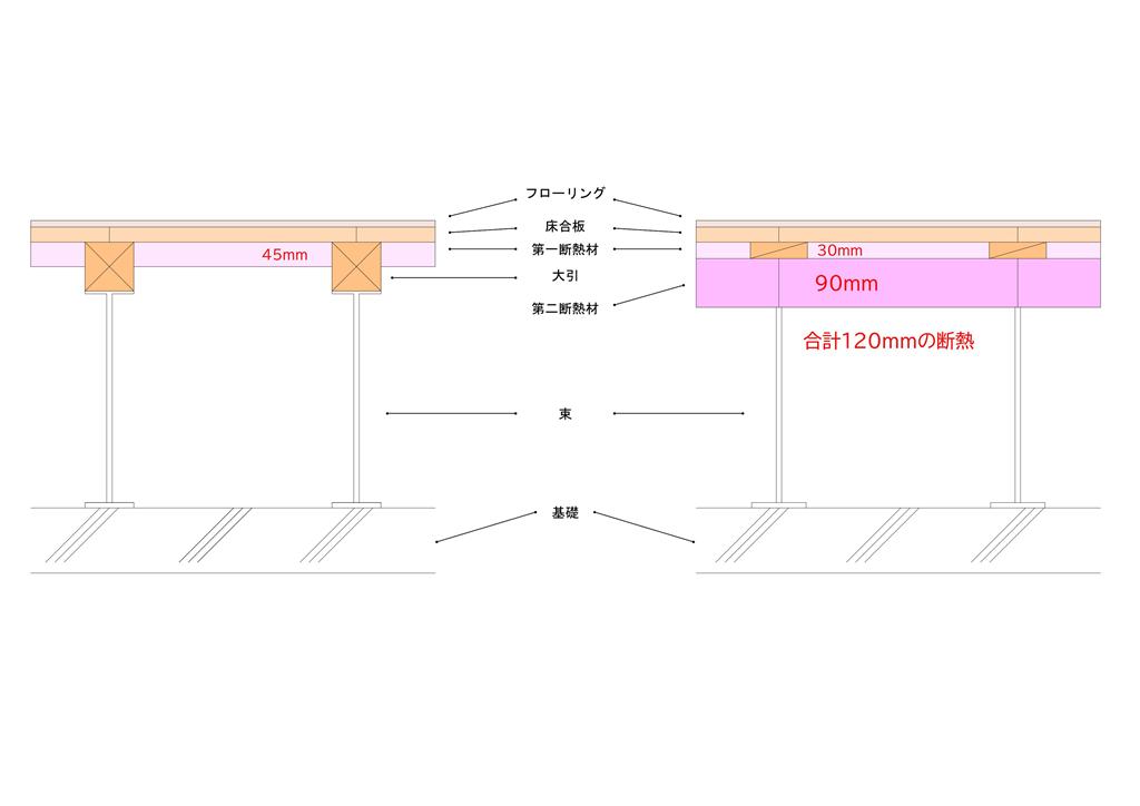 断熱材が第一断熱と第二断熱の二層構造になっており大引部分の断熱材の欠損が無いことも特徴の一つです。