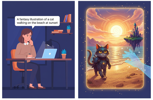 イラストやデザインの作成: 「夕焼けの海辺を散歩する猫のファンタジー風イラスト」のように指示するだけで、プロのようなイラストが出来上がります。