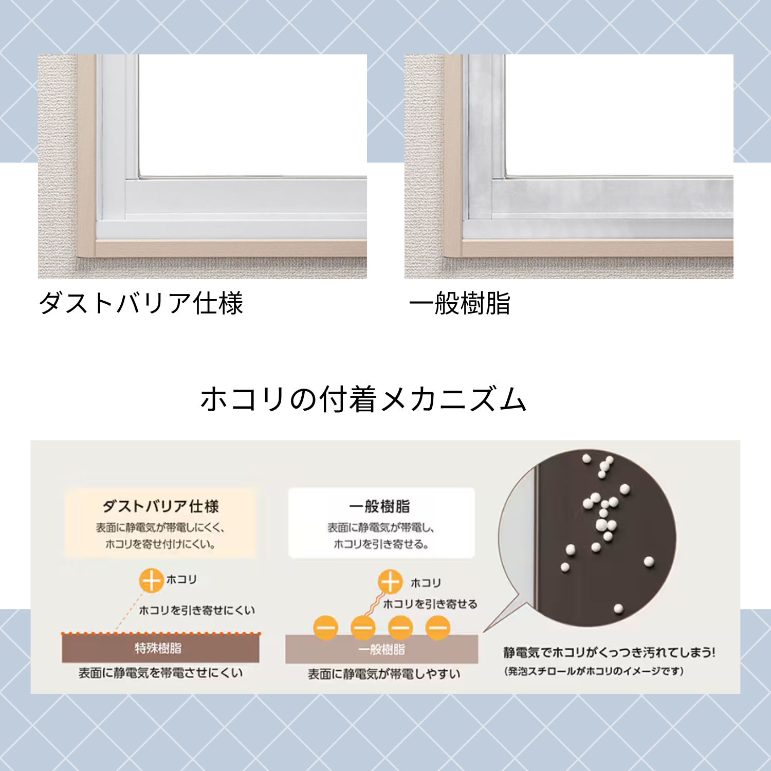 サッシが汚れる原因を科学的に分析して根本から解決したLIXIL独自の技術「ダストバリア」。