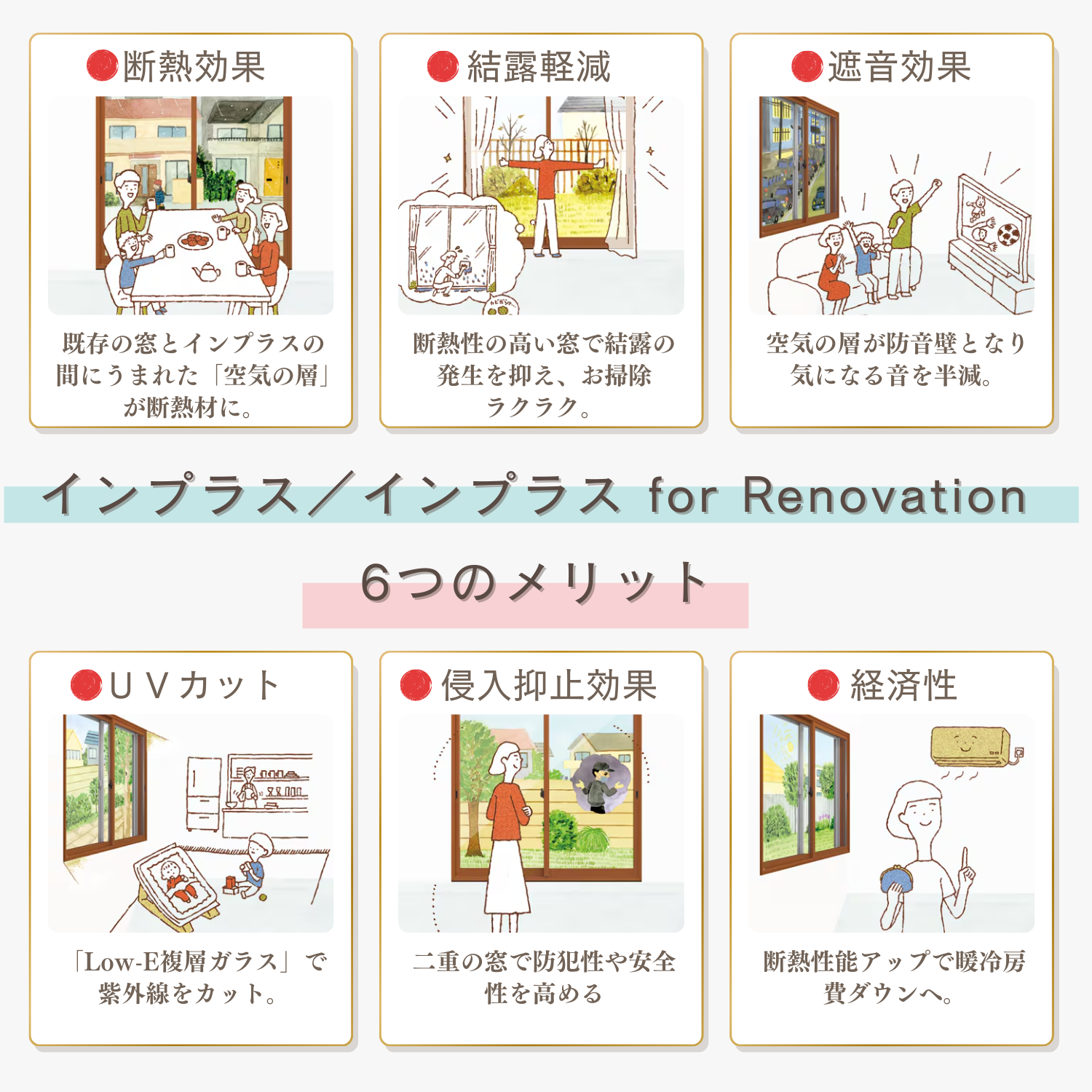 『インプラス/インプラス for Renovation』は、「断熱効果」「結露軽減」「遮音効果」「UVカット」「侵入抑止効果」「経済性」の6つのメリットがあります。